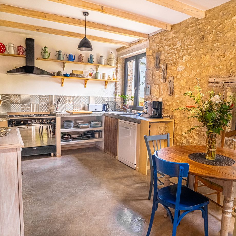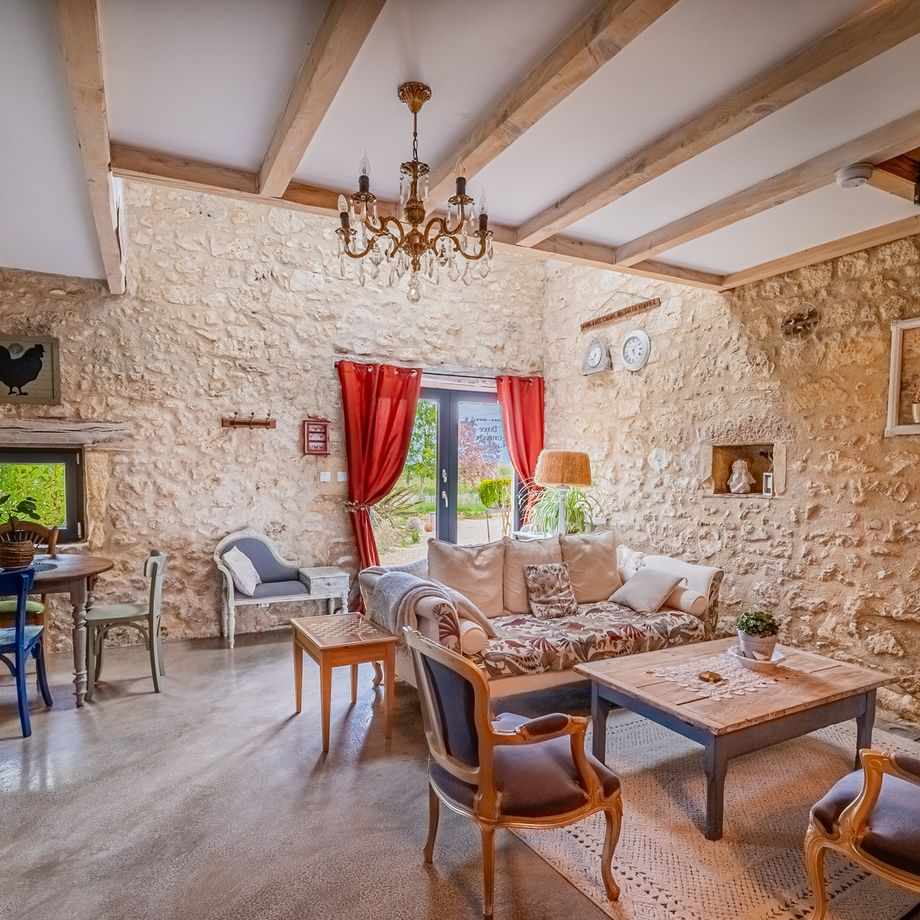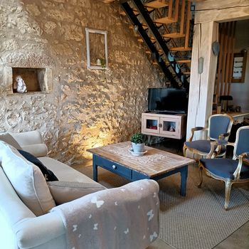Ce cottage offre tout le charme des maisons typiques de Dordogne. Poutres apparentes et murs en pierre lui confèrent une atmosphère douce et chaleureuse.
