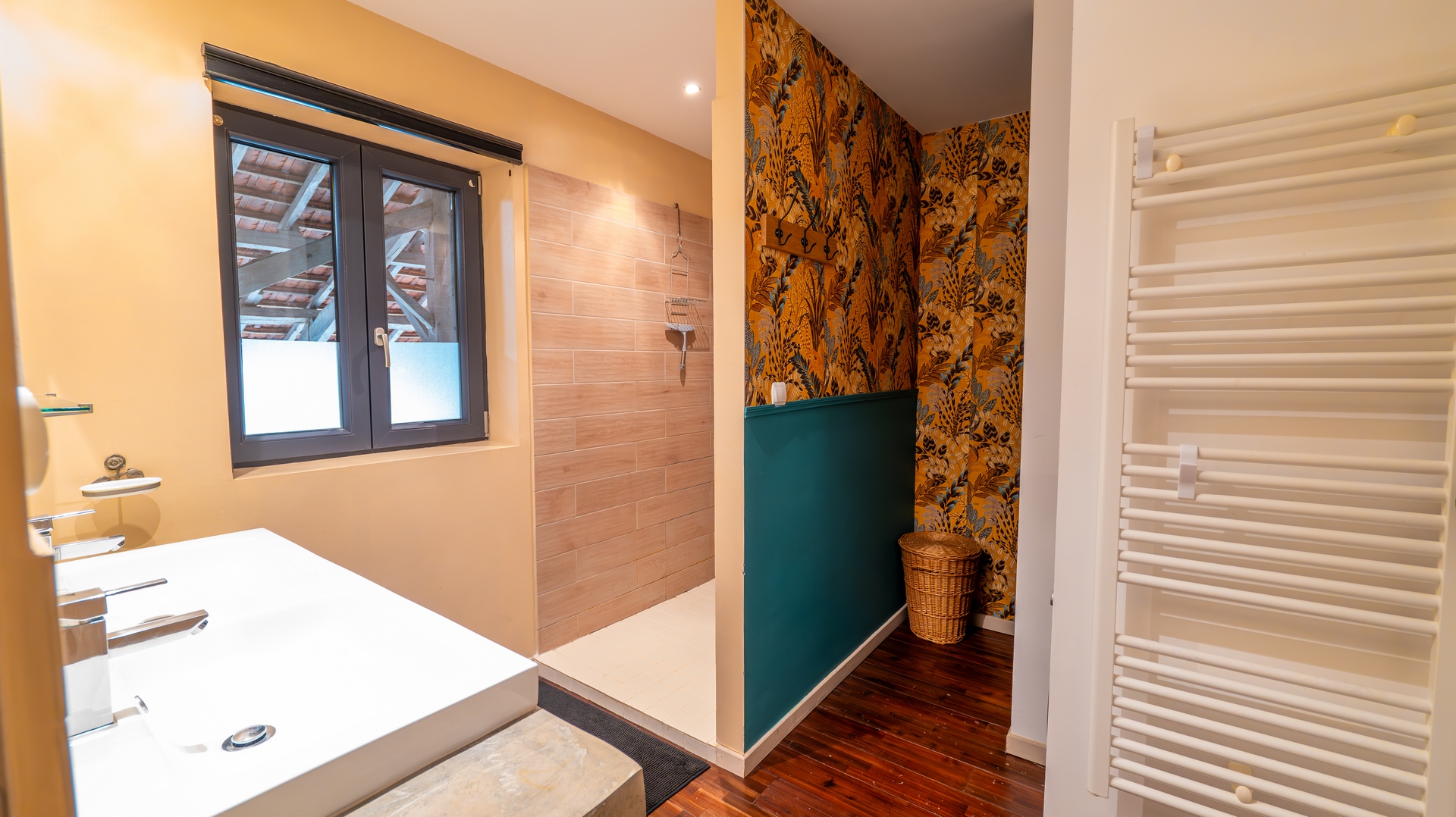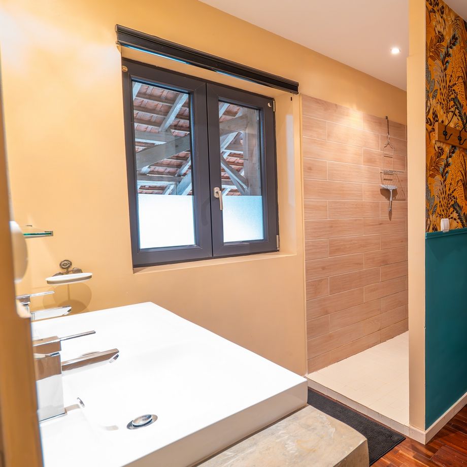 La salle de bain se situe également à l’étage de la maison. Vous y trouverez une grande douche à l’italienne, une double vasque ainsi qu’un WC séparé. Pour votre confort, nous mettons à votre disposition un lave-linge et un sèche-cheveux. C’est une salle d’eau aménagée pour des vacances en famille ou entre amis.