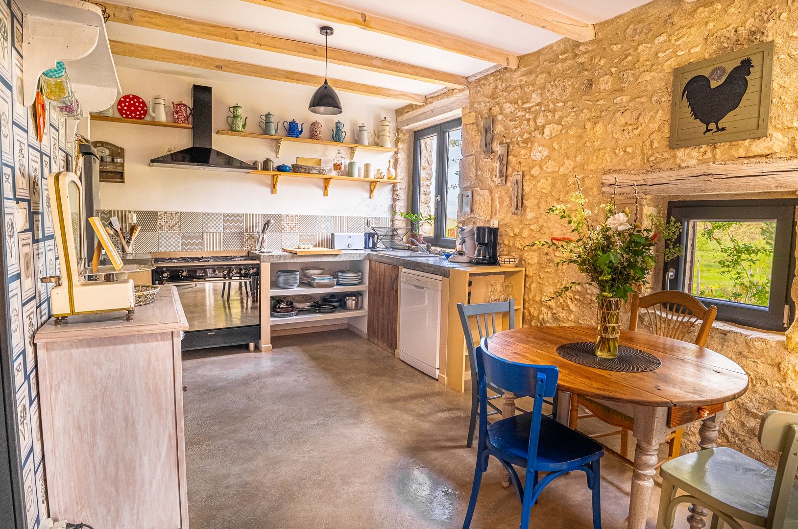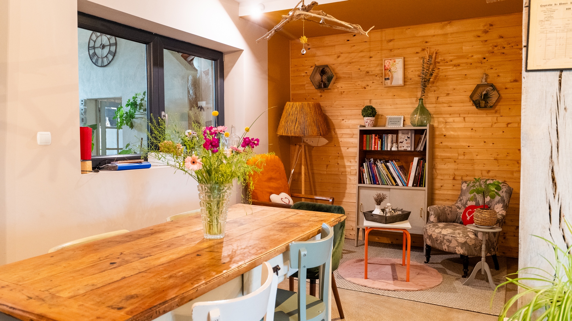 Au cœur de la pièce de vie se trouve le poêle à granulés. Il est idéal pour les soirs d’hiver dans votre gîte de charme au cœur du Périgord pourpre…