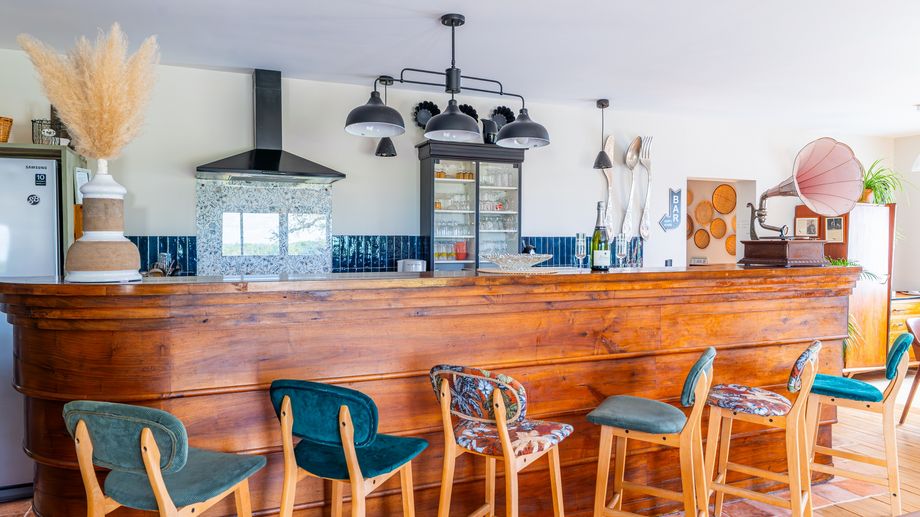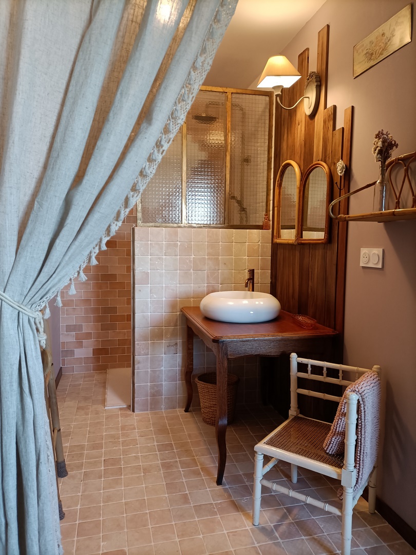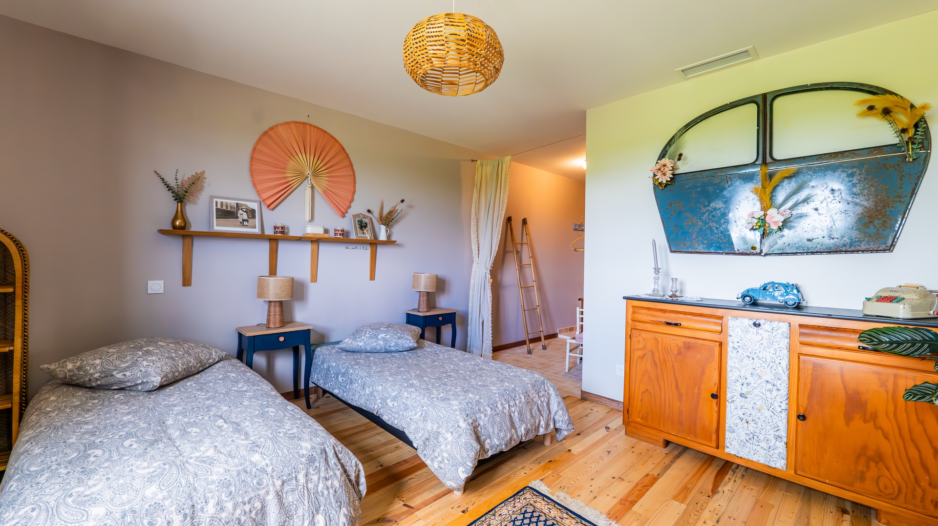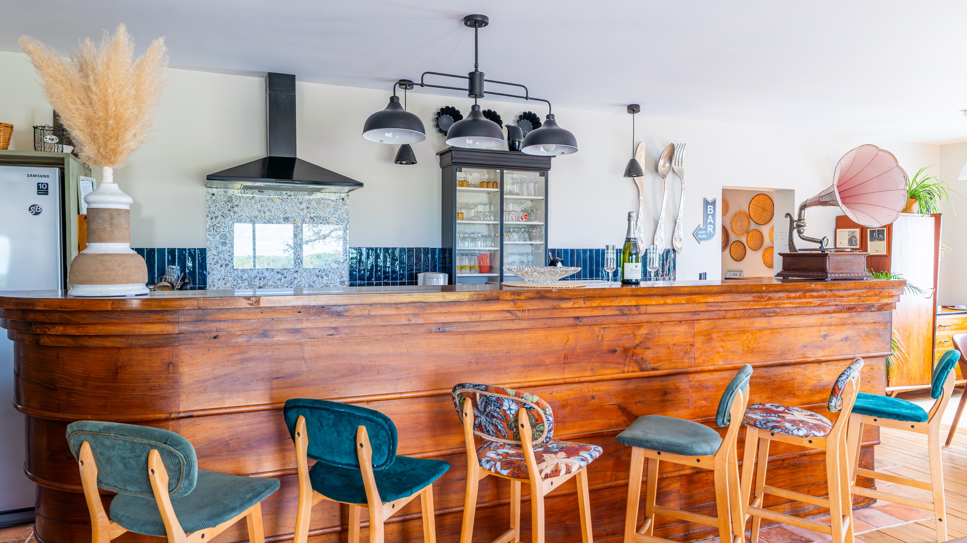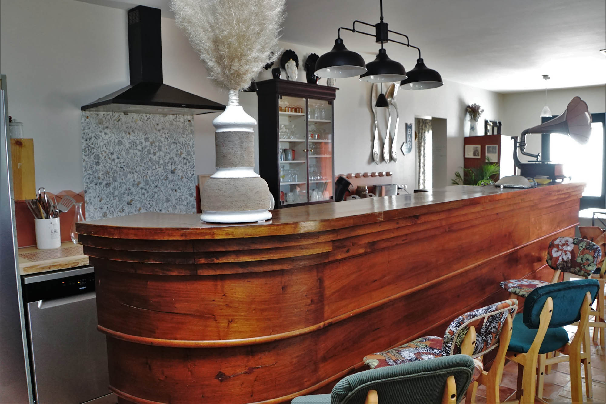Ce gîte en Dordogne est d’une capacité de 4 personnes avec ses 2 chambres ouvertes sur leur salle d’eau respectives avec douche italienne. Il y a un grand comptoir de 1947, qui vous permettra de vous rêver en Barmaid! Toute la décoration a été faite avec des objets chinés ou récupérés. Ils apportent un havre de paix et une ambiance chaleureuse d’époque. Laissez-vous mener par la danse d’autrefois!
